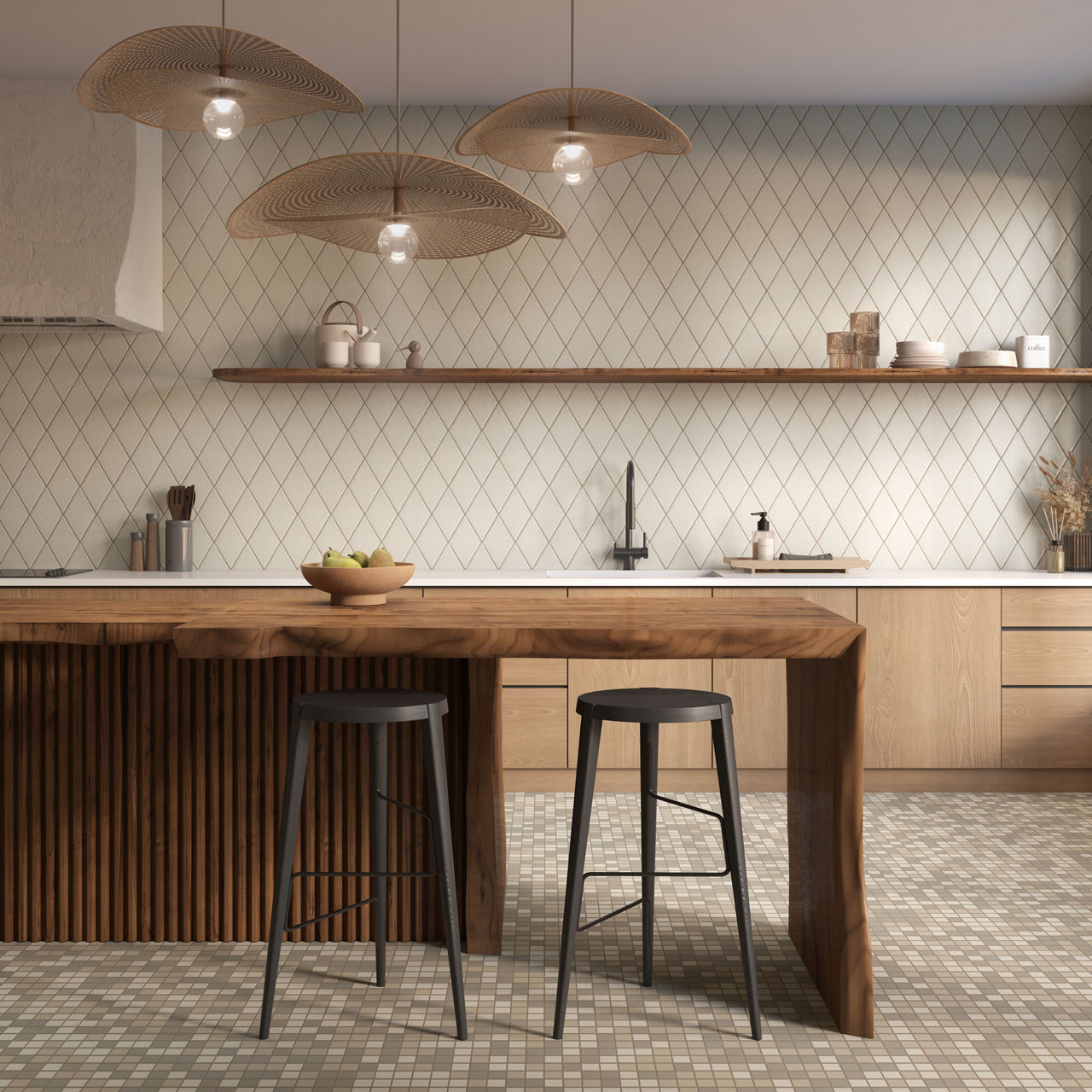Playscapes showcases a lively array of unique wall tile shapes. Each piece has a translucent glaze with an undulated surface mimicking a handcrafted structure while embodying its own sense of style. Perfect for building your personal design aesthetic.